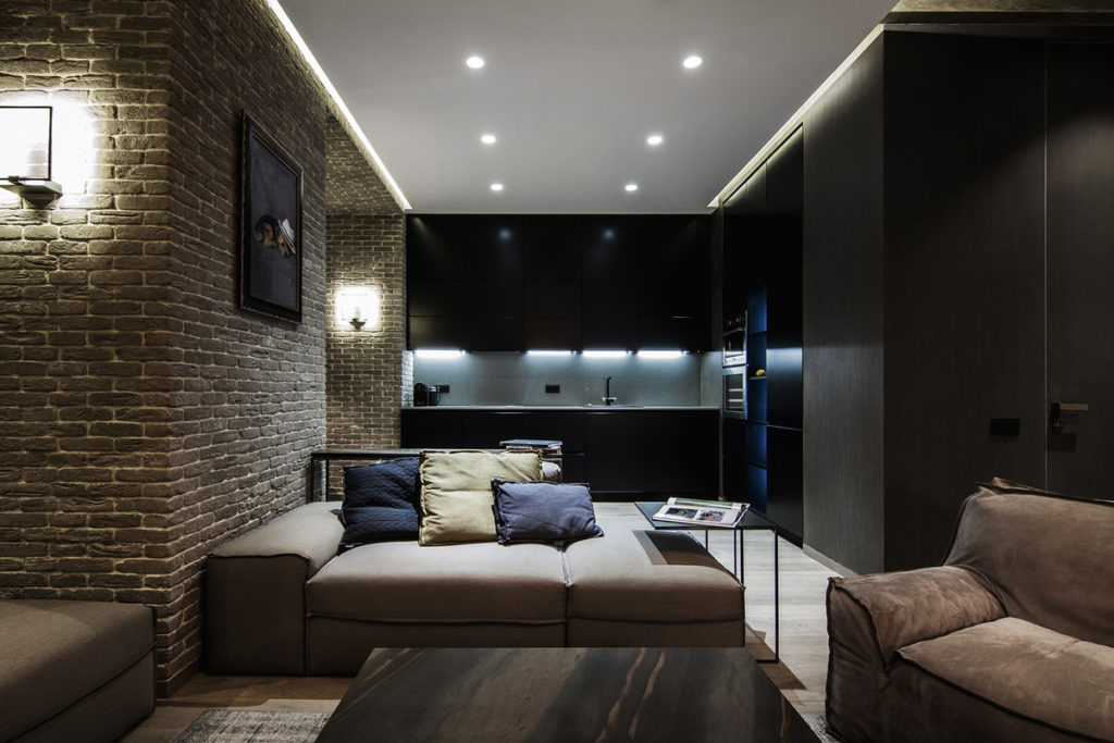 - Освещение в интерьере с натяжным потолком и кирпичной стеной