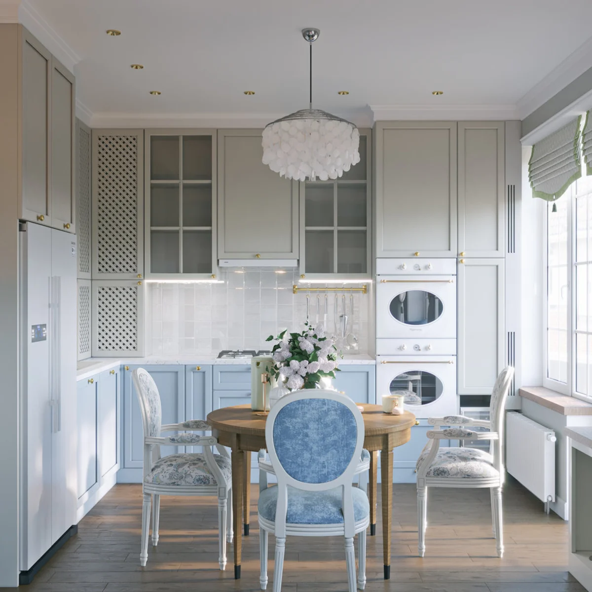 Цветовая палитра стиля Прованс, это мягкие‚ пастельные оттенки‚ вдохновленные природой. Белый – классический выбор для потолка в этом стиле. Он визуально увеличивает пространство‚ создает ощущение легкости и наполняет комнату светом. Однако‚ чистый белый может показаться слишком стерильным‚ поэтому можно выбрать белые оттенки с легким кремовым‚ бежевым или светло-серым подтоном.