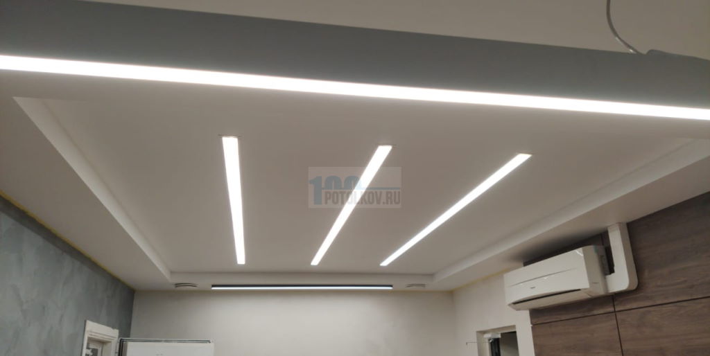 | Глянцевый | Точечные светильники с матовыми рассеивателями‚ светодиодные ленты за потолком | Яркие светильники‚ направленный свет |