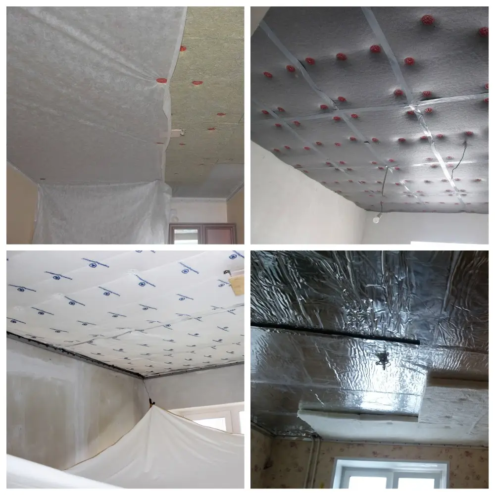 - Использование звукоизоляционных материалов под натяжным потолком. Укладка минеральной ваты или других звукопоглощающих материалов между базовым и натяжным потолком значительно улучшит звукоизоляцию.